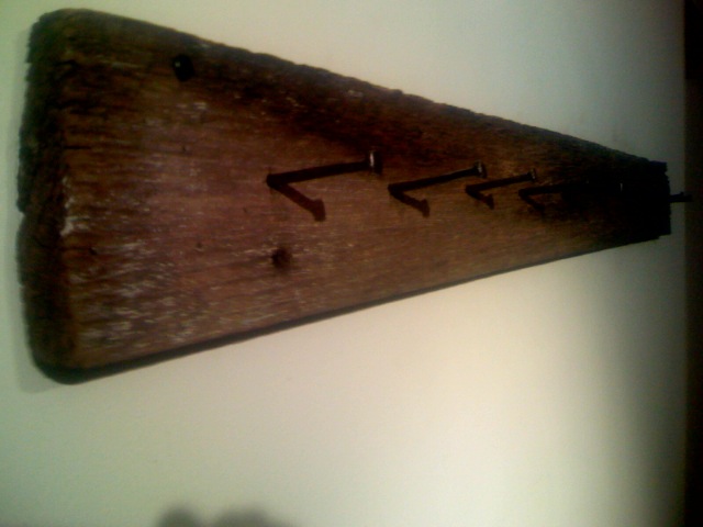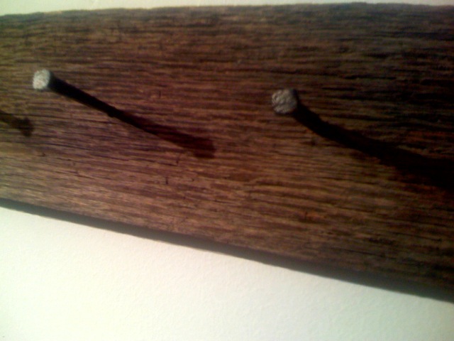 After looking around in vain for a unique coat rack for my entryway, I asked Virtual Farmhusband to make one. We didn’t agree on the board, but we were thrilled to learn that Hoosier Outsider had a stock of old, pre-Civil War nails. VFH shined them up in the wood shop and we took them home.
