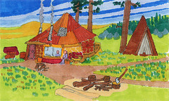 The tepee-looking building next door was Witch’s house, I think. I don’t remember going in there too much when they lived there. Roberts’ outdoor kitchen would have been behind the artist from this view.