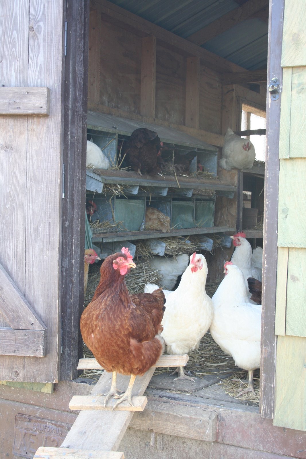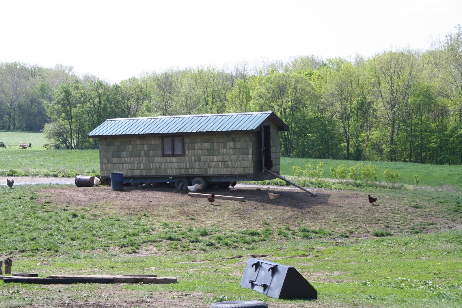 And then we noticed a Joel Salatin-like chicken tractor out back. The free-range chickens were roaming all over the place, but most stayed close to the tractor where there looked to be additional feed, water and, of course, laying boxes.