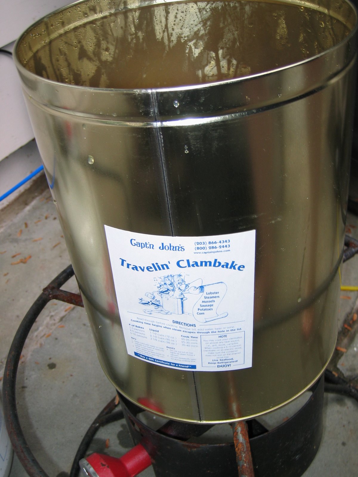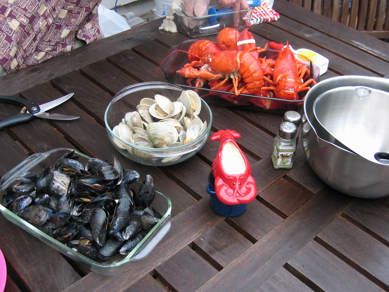 I later learned it was filled to the brim with potatoes, corn on the cob (not shucked but de-silked), kielbasa, mussels, clams and four (live at the time) lobsters.