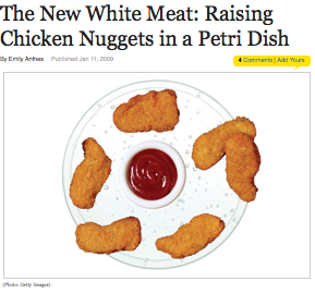 This may be one of the scariest stories I’ve read about food, “The New White Meat: Raising Chicken Nuggets in a Petri Dish” in the latest issue of New York magazine.