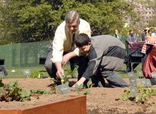 Photo is Vilsack earlier this month getting his hands dirty with school children planting the Obama’s Kitchen Garden, an organic garden on the South Lawn of the White House.