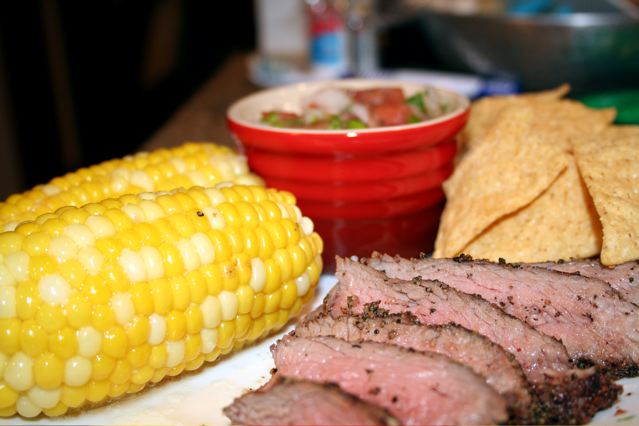 While the iFarmer was outside, firing up the grill and checking the meat in between thunder showers, I chopped up heirloom tomatoes, a fairly hot jalapeno, yellow onion and cilantro (all from King’s Hill Farm) and mixed it into a chunky salsa, then paired it with organic corn chips.