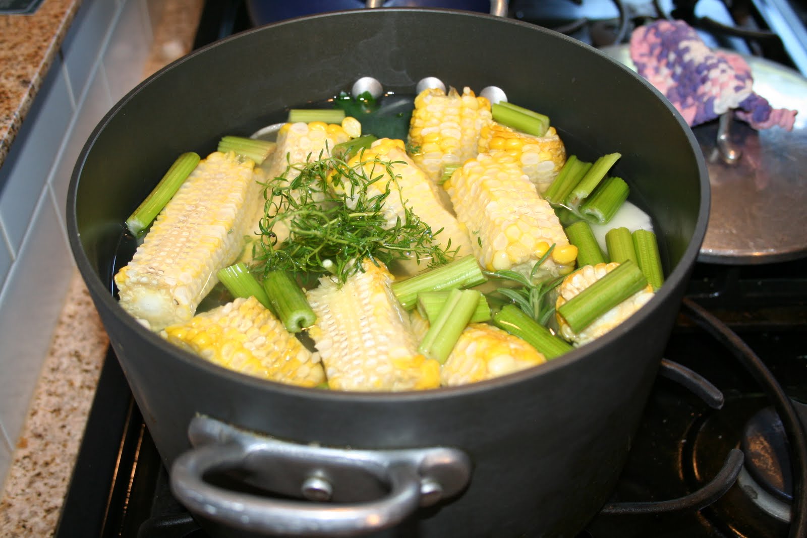 Now I have a very aromatic veggie stock on the stove featuring celery, corn cob bones, onions, bell pepper and a large handful of herbs from my backyard.