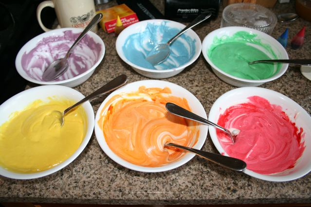 This was so much fun. My son wasn’t interested in any part of this until the eating. But Future Farmgirl was with me from mixing the batter, to dropping in the color and licking the buttercream icing off the spatula.