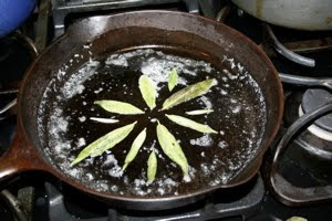 I didn’t get to this recipe for Sage and Honey Skillet Cornbread before the leaves started to brown. So I improvised and threw the best leaves into a little butter, sauteed them for a couple minutes, then covered them up with a batch of cornbread batter.