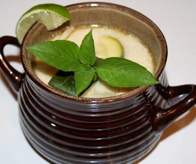 Add lemon leaves and jalapeno. Simmer a few minutes. Add basil and lime juice at the last minute.