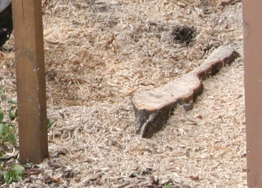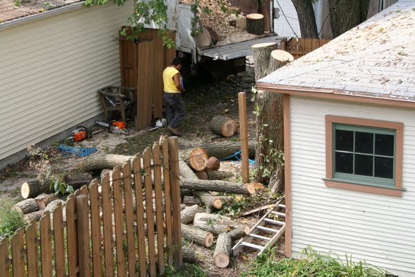 From the pix, you can see that there was one tree climber in the tree to guide the ropes and saw the branches, one by one. Two to three others on the ground would carefully lower each cut branch down, saving our fence, garage and neighbor’s garage. Then the pieces were cut down again and fed into the commercial chipper.When it was all over, the fence row stump was pulverized and the crew did a thorough cleanup of the area, including sweeping off the top of my garage and repairing the fence.