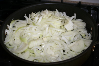 - Eight large onions thinly sliced takes up a much larger pan than I initially expected.