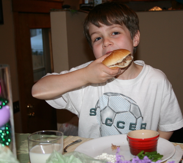 The kids got sides of green beans, peaches and cottage cheese. Sim and I topped ours with slaw, sliced onions that cooked in the juices all day, some mustard/vinegar dressing and a dash (or three) of hot sauce.