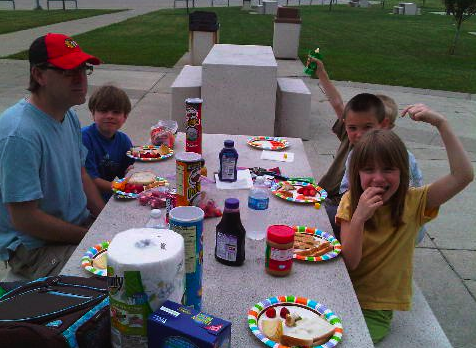 Joann managed to turn a fairly simple supper into a flavorful feast: sweet corn and green beans (cooked in ham broth) that she’d canned herself; ham steaks on the grill, mac-n-cheese; her signature homemade applesauce; her strawberry jam; bread & apple butter. She finished up her kid-pleasing meal with fruit and rice crispy treats. And this morning, we woke to fresh blueberry muffins and hot coffee. I could have stopped right there, kicked back and had a lovely week off.