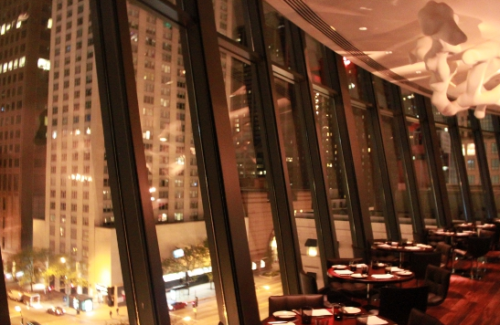 The setting, at the Park Hyatt, offers beautiful views of the city, from a spacious deck, to expansive panoramic bay windows that jut out over the street below and overlook Water Tower park, Michigan Avenue and the lake.