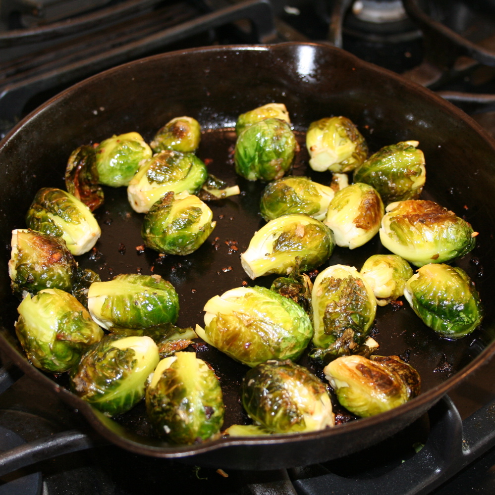 1 pound Brussels sprouts, washed trimmed, w/ extra leaves mixed in pan.
