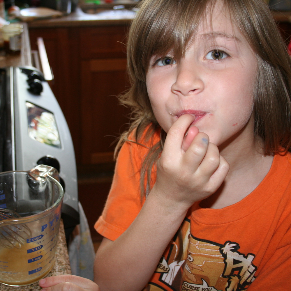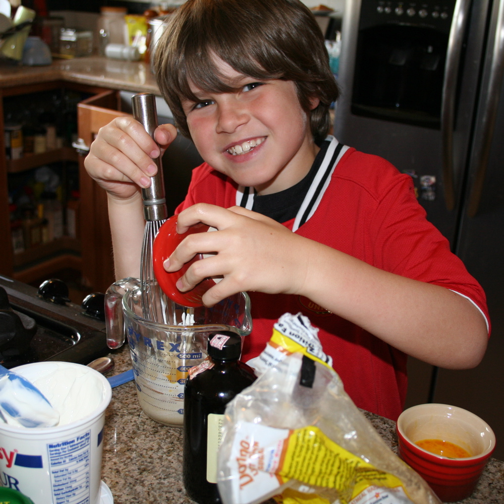 After our successful lunch, the kids moved on to the next recipe — caramel coffee mug coffee cake — for an afternoon treat. This was the more complicated (and required more mixing vessels) of the two recipes, but the one my children enjoyed the most from start to finger-licking finish.