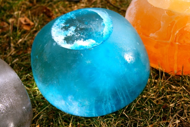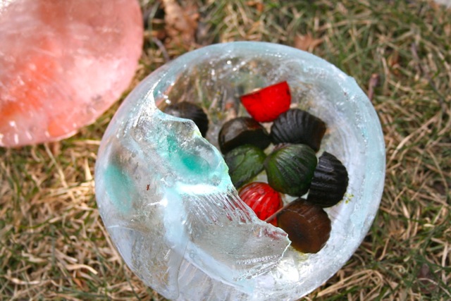 But even with temps in the 40s, we had a great time mixing up colors for a batch of ice marbles. Or, in our case, ice bowling balls.