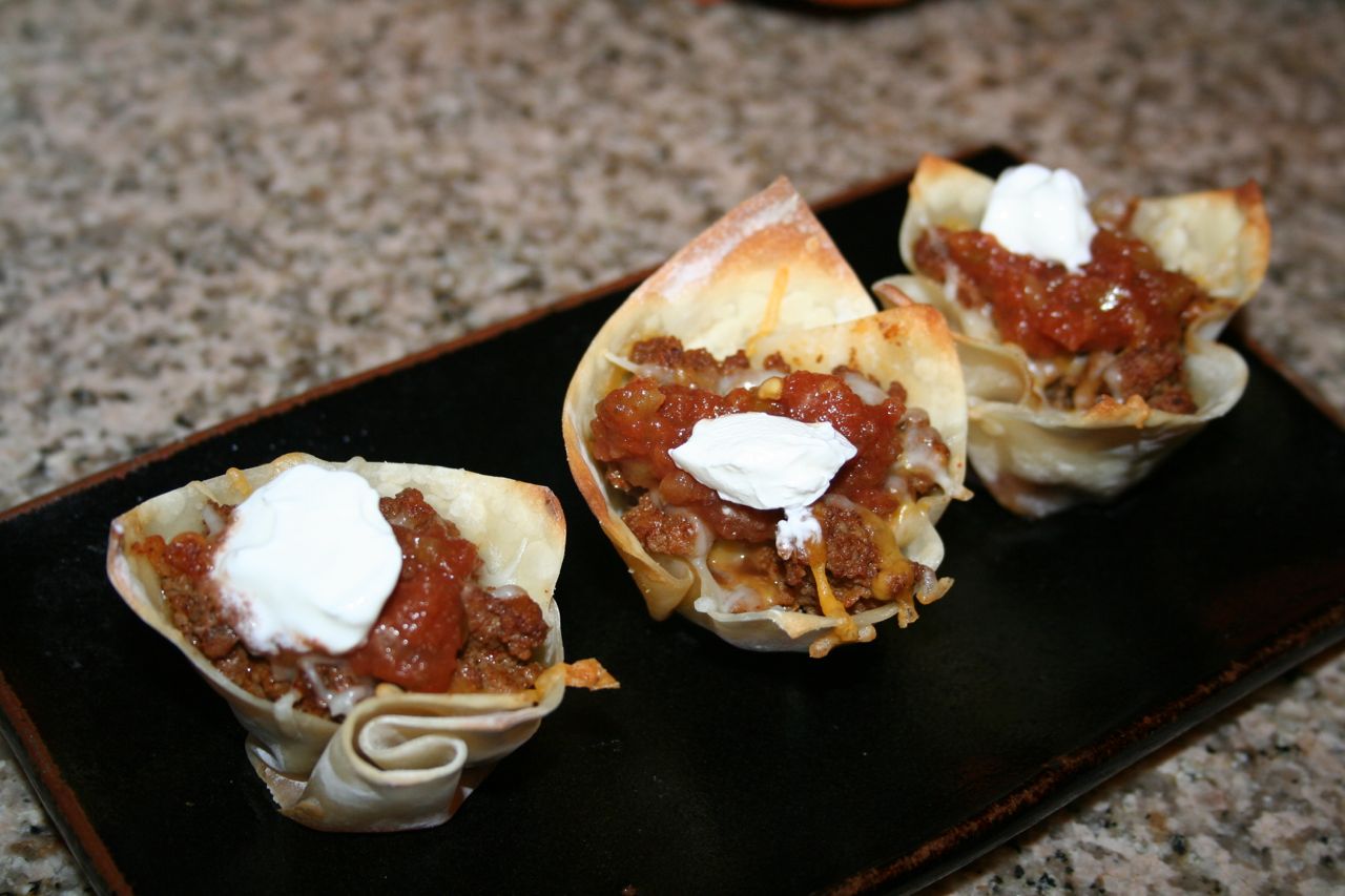 - Sour cream and your favorite toppings (To my son’s dismay, we were out of lettuce, so I lightly sauteed some shredded cabbage, which went great with the wonton shell)