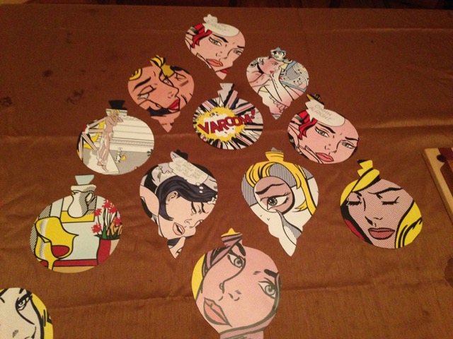 To go along with the art, we decorated in mid-century modern style, complete with Lichtenstein coasters and ornaments (from a recycled calendar), tinsel on the tree, and a pop art tinsel tree with party favor ornaments made from recycles pop cans.