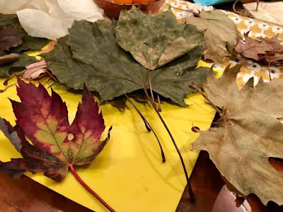 It’s an easy project. I like to hunt for colorful leaves, a mix of small and large ones that haven’t become brittle. I start with a small one, fold down the leaf points to the center, then roll it up, stopping at the leaf center to place a switch or some sort of stick. I continue rolling with progressively larger leaves. Once I have the rose I’m happy with, I bind the base of the rose and the stem with florists tape. I then finish the rose with a matte or satin finishing spray to keep the color and to keep them from crumbling.